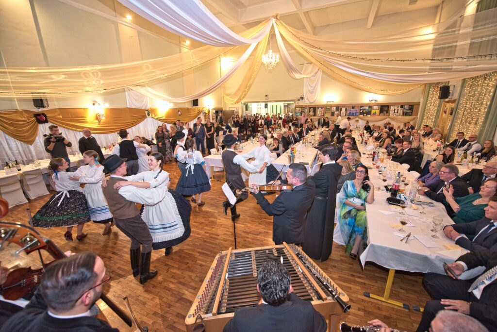 A vendégeket a Lövői zenekar fogadja magyaros népzenével. Fotózás a jubileumi fotófalnál.